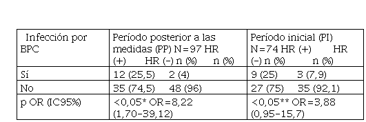 Se comparó la proporción de pacientes con infección posterior por BPC entre los pacientes colonizados y no colonizados del propio período. En este dato, no se obtuvo diferencia significativa (p>0,05), aunque la tasa de infección en los pacientes no colonizados del PP (4,0%) fue menor que la de los respectivos pacientes del PI (7,9%) (Tabla I).