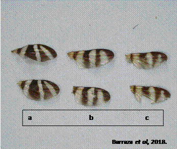 a) Euxesta mazorca, b) E. stigmatias, c) E. annonae