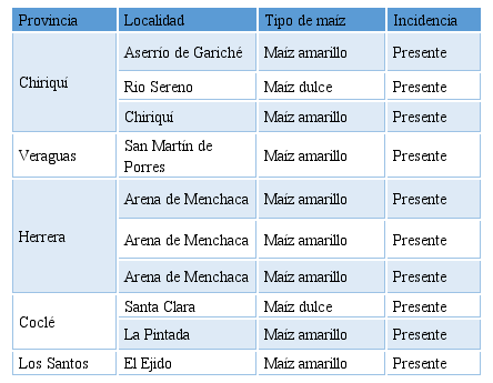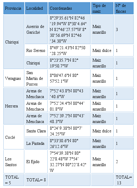 Se lograron muestrear 5 provincias, correspondientes a 4 regiones o zonas productoras de maíz a nivel nacional. En total se muestrearon 13 fincas, distribuidas en 8 localidades diferentes. En todas las fincas muestreadas fue posible encontrar la mosca de los estigmas asociada al cultivo (Ver Cuadros 1 y 2).