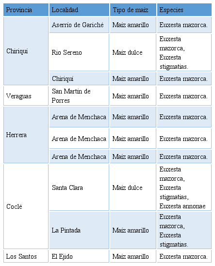 Análisis preliminares realizados en el Laboratorio de Protección Vegetal de la Facultad de Ciencias Agropecuarias de la Universidad de Panamá, en muestras de maíz nuevo procedentes de la provincia de Chiriquí durante el año 2017, permitieron la identificación preliminar del insecto como Euxestasp, Diptera: Ulidiidae=Otitidae, representando el primer reporte de esta plaga en la República de Panamá.