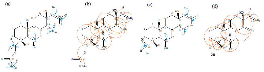 Los valores de 1H-RMN y 13C-RMN para todos los protones y carbonos se asignaron sobre la base de las correlaciones HSQC y HMBC presentados en la Tablas 2 y 3. Los datos espectroscópicos nos permitieron establecer por comparación con los datos reportados en la literatura, la estructura del compuesto (2), asignado como 6?-hidroxi-18-acetoxicassan-13,15-dieno ( Figura 1). ( Torres et al., 2003).