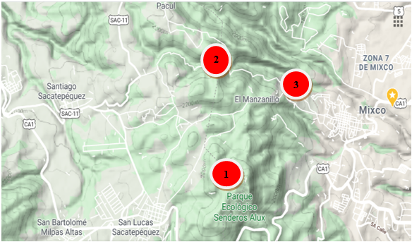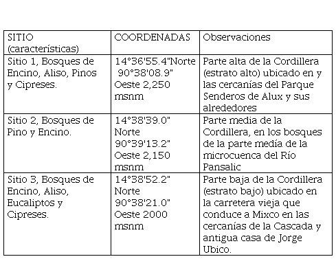 ÁREA DE ESTUDIO. En el Plan Maestro del Área Protegida ( CONAP 2008) la Reserva Forestal Protectora de Manantiales Cordillera Alux, abarca parte de los municipios de Mixco, San Pedro Sacatepéquez y San Juan Sacatepéquez, del departamento de Guatemala, los municipios de Santiago Sacatepéquez y San Lucas Sacatepéquez, del departamento de Sacatepéquez, siendo el municipio de Mixco (39.34%) el que abarca mayor área, seguido de los municipios de San Pedro Sacatepéquez (31.55%), Santiago Sacatepéquez (16.73%), San Lucas Sacatepéquez (9.20%) y San Juan Sacatepéquez (3.18%). El perímetro de la Cordillera Alux mide 29.32 km2 entre las coordenadas Latitud Norte 14°36´42? y 14°42´00? y Longitud Oeste 90°36´26? y 90º 39´05?. Se hicieron visitas mensuales de campo y se seleccionaron tres altitudes donde se obtuvieron las muestras. Los insectos se colectaron con mangas entomológicas en transectos de 500 m en horario de 8:00 -16:00 h. La identificación se hizo a través de la comparación de las especies en la colección de insectos de la Facultad de Agronomía de la Universidad de San Carlos de Guatemala ( cuadro 1, figura 1).