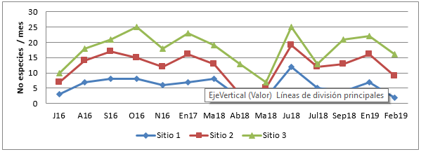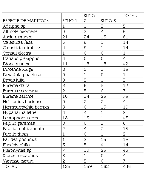 La presencia de mariposas diurnas fue notable a lo largo de todo el año ( figura 2). La totalidad de las colectas efectuadas 125 mariposas se obtuvieron en el Sitio 1, 159 en el Sitio 2 y 162 en el Sitio 3.