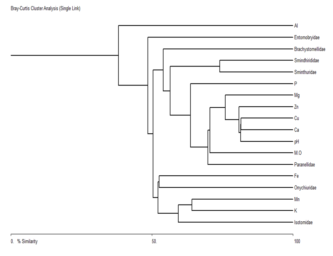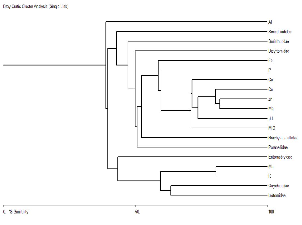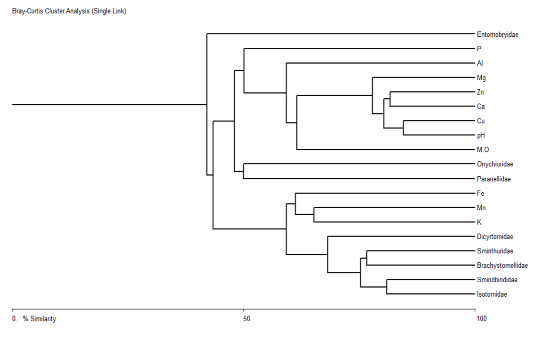 El dendrograma de correlación entre los factores químicos edáficos y las familias de Collembola, generado a través del Análisis de Cluster Bary-Curtis, para el área sin aplicación del herbicida durante los seis meses de muestreo, indicó que las familias Brachystomellidae, Paronellidae y Dicyrtomidae, están mayormente correlacionadas con los factores químicos edáficos materia orgánica, pH, calcio y fósforo, en una proporcion mayor del 50%. Mientras que las familias Sminthuridae y Sminthurididae, están relacionada con estos mismos factores, en un porcentaje menor a un 50%. La familia Isotomidae y Onychiuridae, están más correlacionadas con el factor potasio, aproximadamente en un 80%, ( Figura 1).