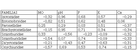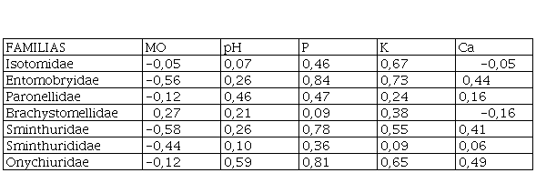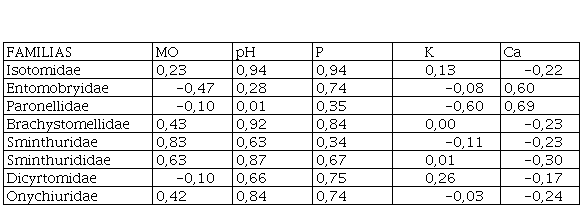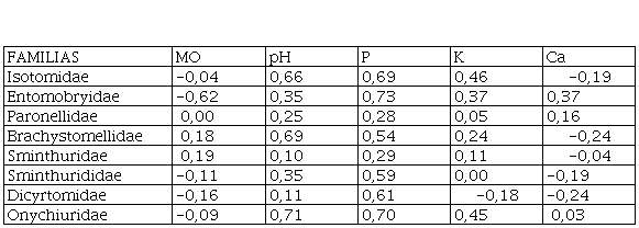 La familia Isotomidae, presentó correlación positiva significativa con el factor pH; la familias Paronellidae, Brachystomellidae, Sminthurididae y Onychiuridae, presentaron correlación positiva con el pH y fósforo; las familias Sminthuridae y Dicyrtomidae, presentaron correlaciones positivas significativas con el fósforo y la familia Onychiuridae presentó correlación positiva significativa con el fósforo y potasio ( Tabla 6).