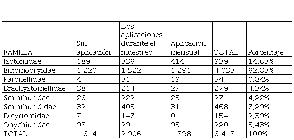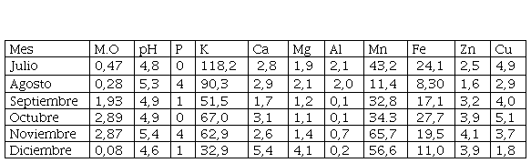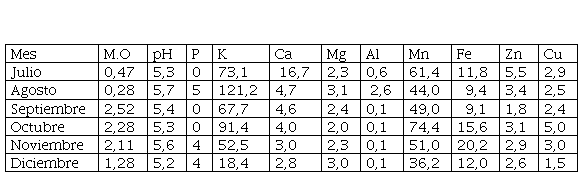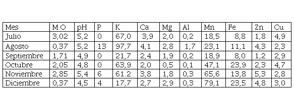 En el estudio se colectaron 6 418 especímenes de Collembola, distribuidos en ocho (8) familias (Isotomidae, Entomobryidae, Paronellidae, Brachystomellidae, Sminthuridae, Sminthurididae, Dicyrtomidae, Onychiuridae), que fueron encontradas en las tres áreas de estudio (Tabla 1). Los datos del análisis de suelo a cada una de las áreas estudiadas, para conocer los factores químicos edáficos presentes durante los seis meses de muestreo, arrojaron que los mismos fueron: materia orgánica (M.O.), pH, fósforo (P), potasio (K), calcio (Ca), magnesio (Mg), aluminio (Al), manganeso (Mn), hierro (Fe), zinc (Zn) y cobre (Cu) (Tablas 2, 3 y 4).