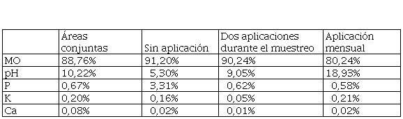 La prueba de Componentes Principales, permitió establecer que las variables químicas edáfica con mayor peso sobre las poblaciones de familias de Collembola, tanto para el conjunto de las tres áreas, como para las áreas sin aplicación de herbicida, con dos aplicaciones del herbicida y la de aplicación mensual del herbicida fueron: materia orgánica, pH, fósforo, potasio y calcio. El resto de los factores químicos edáficos medidos, ejercen efectos muy bajos sobre las poblaciones de Collembola ( Tabla 5).