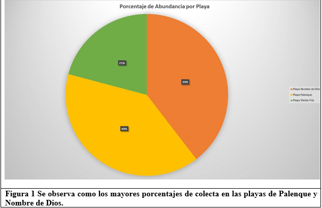 Al comparar la abundancia de las playas se encontró que en la playa de Palenque se encontró 40% de la colecta ,seguido de Nombre de Dios con el 39% y Viento Frío con el 21% ( Ver figura 1), No hay diferencia de abundancia no es significativa (F=0.5984; p>0.5552), lo que concuerda con lo encontrado en la playas de Piña, donde la falta de diferencia entre los muestreos pudo deberse a la condiciones ambientales reinantes (Acosta y Lima, 1997; González et al, 2011; González et al, 2018; González et al, 2019). Tal vez porque la estructura del sustrato de estas tres playas es bastante similar, conformado principalmente por planchas de coral y arenas ( Aguilar et al, 2010; Miloslavich, y Huck 2009), con praderas de hierbas marinas del género Thalassia. ( Figura 1) ( Capelo y Buitrago, 1998; Correa-Sandobal y J. Rodriguez; 2013; González et al. 2018; Kohn, 1970)