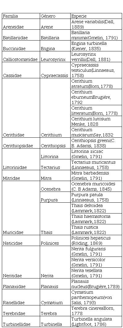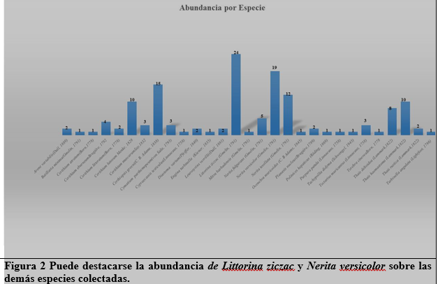 Puede destacarse la abundancia de Littorina ziczac y Nerita versicolor sobre las demás especies colectadas.
