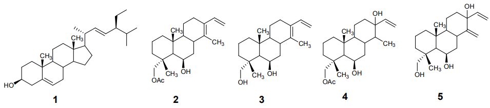 El estudio del extracto crudo de acetato de etilo/metanol de hojas maduras de Myrospermum frutescens condujo al aislamiento de cinco compuestos, de los cuales, el compuesto (1) es un triterpeno identificado como estigmasterol, y los cuatro restantes, corresponden al grupo de diterpenos tipo cassano; dos de ellos, (2 y 3), han sido reportados previamente en la literatura y los otros dos, (4 y 5) no registran valores que indiquen concordancia con los reportados en estudios previos realizados a Myrospermum frutescens.