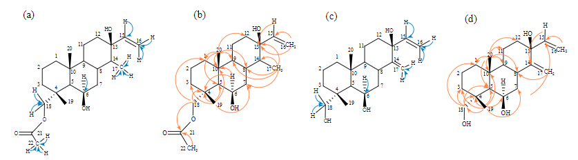El espectro HMBC presentó la correlación de los protones en 6.06 (H-15), 5.20 (H-16) y 5.26ppm (H-16) con el carbono en 74.91 ppm (C-13). Se observaron también la correlaciones de los protones en 5.20 (H-16) y 5.26 ppm (H-16) con el carbono en 143.26 ppm (C-15). De manera similar se observó la correlación del protón en 4.35 ppm (H-6) con los carbonos en 37.09 (C-4) y 37.23 ppm (C-10). Por otro lado, mostró la correlación de los protones metilénicos en 3.69 (H-18) y 4.03 ppm (H-18) con los carbonos en 37.09 (C-4), 37.59 (C-1), y 171.30 ppm (C-21) (Figura 2b).