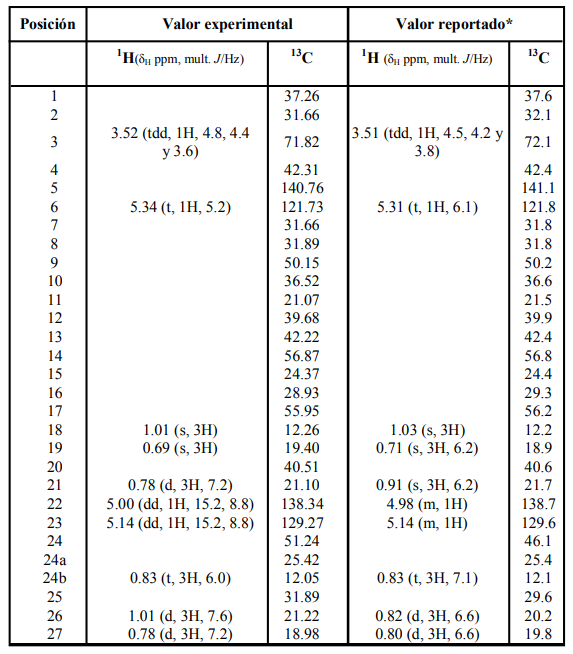 El espectro 13C-RMN mostró señales para 29 carbonos en los que se confirmó la presencia de carbonos metilos angulares a 12.26 y 19.40 ppm. También se observarón las señales en 140.76, 138.34, 129.27 y 121.73 ppm indicativas de enlaces dobles; y la señal correspondiente a carbono unido a grupo hidroxilo a 71.82 ppm. Estos datos fueron confirmados mediante experimentos DEPT 135 donde se observó señales para 26 carbonos distribuidos de la siguiente forma: seis carbonos metilos, nueve carbonos metilénicos y diez carbonos metínicos. La confirmación de la estructura se realizó a través de los espectros bidimencionales HSQC y HMBC y por comparación con los datos reportados en la literatura (Tabla 1) (Chaturvedula y Prakash, 2012). Se determinó la estructura del compuesto (1), como Estigmasterol (Figura 1).