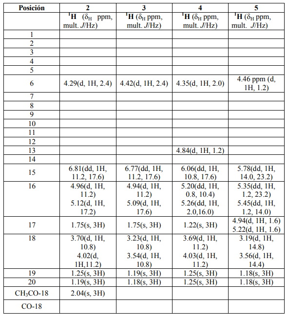 El estudio de los valores espectroscópicos de IR, 1H-RMN, 13C-RMN y experimentos de correlación hetereonuclear (HSQC y HMBC) permitieron establecer la estructura del compuesto (5), asignado como 6,13,17- trihidroxicassano-14,(17)15-dieno (Figura 1). Para este caso, no se ha encontrado concordancia con los valores reportados por estudios previos realizados a ésta planta es por ello que adjudicamos el aislamiento de este nuevo compuesto a Myrospermum frutescens (Torres et al., 2003), (Torres et al., 2004).