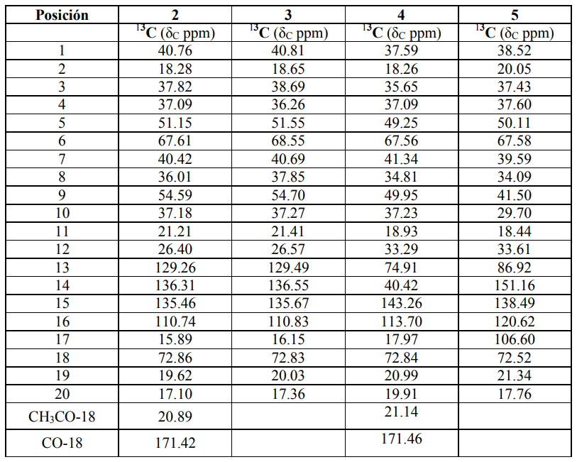 El espectro13C-RMN mostró señales para 20 carbonos en los que se confirmó la presencia de carbonos de metilo a 16.15, 17.36 y 20.03 ppm. También se observó las señales en 136.55, 135.67, 129.49 y 110.83 ppm indicativas de enlaces dobles en la molécula. Además, de la señal en 68.55 ppm que corresponden a un átomo carbono enlazado a un hidroxilo -OH y la señal en 72.83 ppm correspondiente a un carbono de metileno adyacente a un átomo de oxígeno (-CH2-O-).