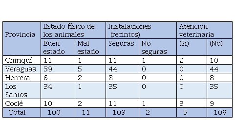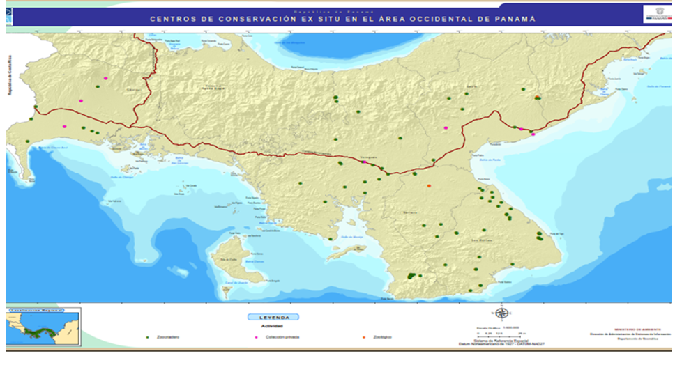 En la investigación se determinó que en la región occidental de Panamá, existen 111 sitios de conservación de fauna silvestre ex situ, de los cuales 102 fueron zoológicos, 7 fueron colecciones privadas y dos fueron zoológicos, distribuidos en 9 en la provincia de Chiriquí, 43 en la provincia de Veraguas, 7 en la provincia de Herrera, 35 en la provincia de Los Santos y 8 en la provincia de Coclé. De los 111 sitios de conservación de fauna silvestre en cautiverio 38 estaban establecidos legalmente, 38 eran sitios ilegales y 35 estaban en trámite de legalización. En 100 de los 111 sitios de conservación de fauna silvestre ex situ en la región occidental, los animales se encontraban en buen estado de salud física; en109 de los sitios las instalaciones eran seguras para los animales y solo 5 de los 111 sitios de conservación de fauna silvestre exsitu contaban con atención veterinaria. Estos resultados arrojaron la existencia de una gran cantidad de sitios existente en esta región del país, de los que Ministerio de Ambiente desconocía su existencia, su estatus legal, condiciones y atención dada a esa fauna silvestre en cautiverio.