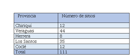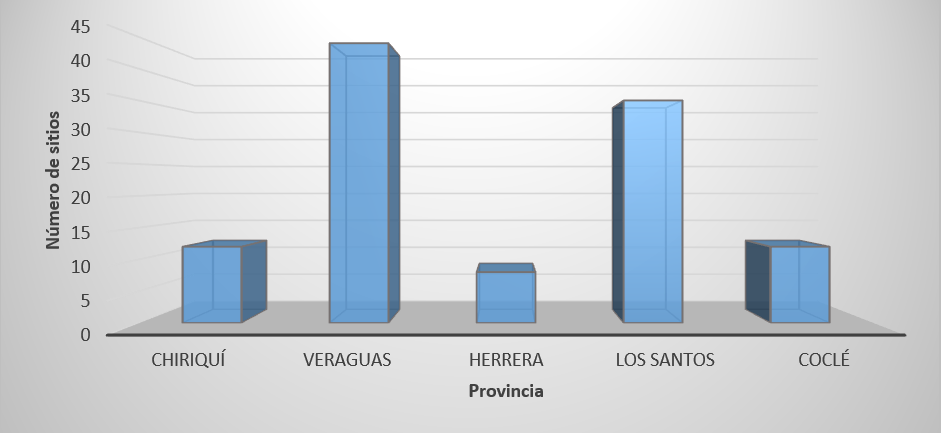 En la investigación de localizaron en la región occidental de Panamá 111 sitios de conservación ex situ, distribuidos 12 en la provincia de Chiriquí, 44 en la provincia de Veraguas, 8 en la provincia de Herrera, 35 en la provincia de Los Santos y 12 en la provincia de Coclé ( Tabla 1, gráfica 1).