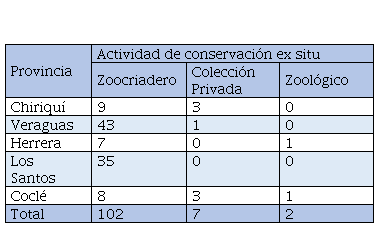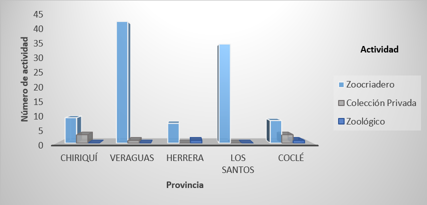 De un total de 102 zoocrideros encontrados en esta región occidental de Panamá, 9 se encontraron en la provincia de Chiriquí, 43 se encontraron en la provincia de Veragua, 7 se encontraron en la provincia de Herrera, 35 se encontraron en la provincia de Los Santos y 8 se encontraron en la provincia de Coclé. También se encontraron 7 colecciones privadas, distribuidas tres en la provincia de Chiriquí, 1 en la provincia de Veraguas y tres en la provincia de Coclé. Además, se encontraron dos zoológicos, ubicados 1 en la provincia de Herrera y 1 en la provincia de Coclé ( Cuadro 2, gráfica 2).