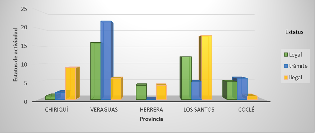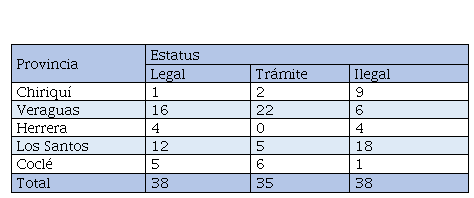De los 111 sitios con actividad de conservación ex situ en la región occidental de Panamá, se encontró que 38 de estos sitios tenían un trámite legal ante el Ministerio de Ambiente, 35 sitios estaban en trámites y 38 sitios estaban ilegalmente establecidos ( Tabla 3, gráfica 3).