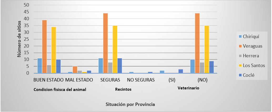 De los 111 sitios con actividad de conservación ex situ en la región occidental de Panamá, se encontraron 100 sitios con animales en buen estado físico, 11 con animales en mal estado físico; 109 de las 111 instalaciones eran seguras para albergar a los animales en cautiverio y dos no eran segura; De los 111 sitios con animales en cautiverio encontrados solo 5 contaban con atención veterinaria y 106 carecían de esta atención. En la provincia de Chiriquí, se encontró que en 11 de los sitios con animales silvestres en cautiverio estaban en buen estado físico y en un sitio los animales estaban en mal estado físico; en la provincia de Veraguas se encontró que 39 sitios que contenían animales silvestres en cautiverio, estos estaban en buen estado físico y en cinco sitios los animales no se encontraban en buen estado físico; en la provincia de Herrera 6 sitios que contenían animales silvestres en cautiverio, estos estaban en buen estado físico, mientras que solo en dos sitos los animales estaban en mal estado físico; en la provincia de Los santos se encontró que 34 de los sitios tenían los animales silvestres en cautiverio en buen estado físico y solo en un sito no se encontraron los animales silvestres en buen estado físico. En la provincia de Chiriquí y Coclé se encontraron que 11 sitios respectivamente que contenían animales silvestres en cautiverio tenían instalaciones seguras y solo 1 sitio en cada provincia su instalación no era segura; mientras que los 44 sitios de la provincia de Veraguas, los 8 sitos de la provincia de Herrera y los 35 sitios de la provincia de Los Santos, que contenían animales silvestres en cautiverio tenían instalaciones seguras. De los 12 sitios con animales silvestre en la provincia de Chiriquí, 2 contaban con atención veterinaria y 10 no contaban con este tipo de atención; En la provincia de Coclé se encontró que tres sitios que contenían animales silvestres en cautiverio, tenían atención veterinaria y 5 sitios no contaban con este servicio; mientras que los 44 sitios presentes en Veraguas, 8 sitos presentes en Herrera y los 35 sitios presentes en Los Santos, que contenían animales silvestres en cautiverio carecían de atención veterinaria ( Tabla 4, gráfica 4). Respecto a las instalaciones seguras, salud de los animales y atención veterinaria para la fauna silvestre en cautiverio ANAM (2004), indica que estos centros deben mantener las condiciones propicias de seguridad necesarias para evitar la entrada o salida de un caso fortuito o de fuerza mayor de los ejemplares; igualmente deberán mantener las condiciones de salubridad, para prevenir la propagación de enfermedades y contar con áreas específicas para exhibición, reproducción y cuarentena, según la actividad