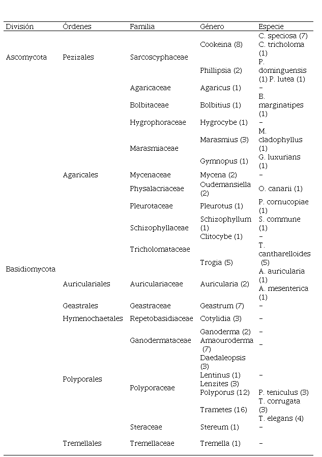 Dentro de los Ascomycota se encontraron representantes del Orden Pezizales, mientras que en Basidiomycota se encontraron órdenes como: Agaricales, Polyporales, Hymenochaetales, Tremellales, Geastrales y Auriculariales.