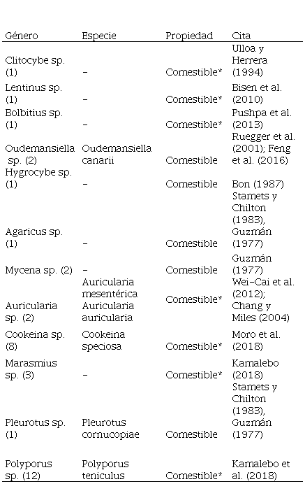Por otro lado, Schizophyllum commune es descrito como una fuente potencial de antioxidantes naturales y propiedades antidiabéticas (Chandrawanshi et al., 2017). Otro de los géneros de gran interés medicinal es Tremella sp., cuya principal propiedad es su aplicación en medicina para mejorar el sistema inmunológico (De Baets y Vandamme, 2001). El género Oudemansiella sp, es reportado como uno de los que incluye muchas especies consumidas a nivel mundial (Feng et al., 2016). En un estudio etnomicológico realizado en la República del Congo se reporta a Cookeina speciosa por su uso recreacional y alimenticio; de igual manera fueron reportadas como comestibles especies de Auricularia sp. tales como A. cornea y A. delicata, especies del género Agaricus sp. como A. bambusicola y A. crocopeplus, algunas especies del género Marasmius sp. y Polyporus tenuiculus (Kamalebo et al., 2018).