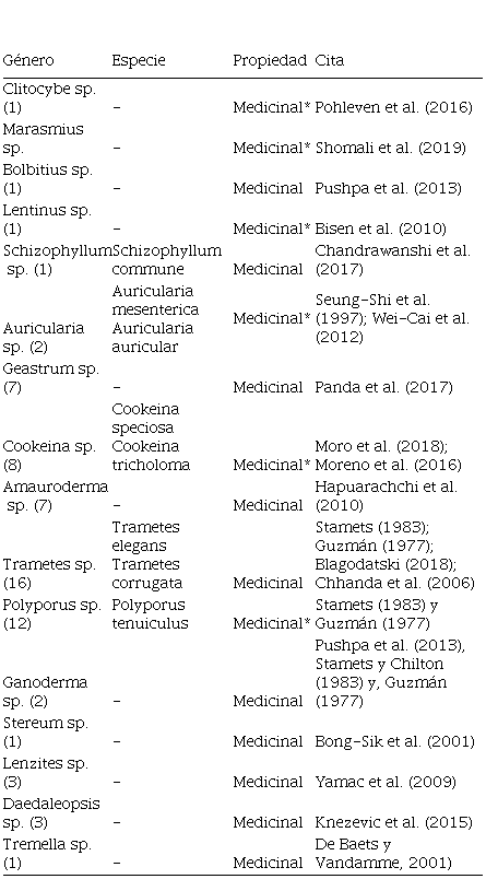 Dentro de los géneros identificados existen reportes de especies productoras de compuestos bioactivos de interés en medicina. Pushpa et al., (2013) demostró la presencia de metabolitos de interés que pueden tener importancia para la industria farmacéutica y alimentaria en Bolbitius vitellinus y de Ganoderma applanatum. En general, las especies de la Familia Ganodermataceae han sido ampliamente usadas como medicina tradicional en Asia por muchos siglos, así como también Ganoderma sp. y Amauroderma sp. son ampliamente estudiadas debido a sus propiedades medicinales (Hapuarachchi et al., 2010). Polyporus tenuiculus fue otra de las especies frecuentes durante las colectas; cuyo primer reporte de su cultivación fue dado en desperdicios lignocelulósicos, y es señalada como una prometedora especie tanto para la producción comercial como por su potencial uso en la degradación de biodesperdicios (Omarini et al., 2009). De igual forma, se han reportado una actividad antimicrobiana considerable de metabolitos de una rara especie de Geastrum sp. (Panda et al., 2007). A el hongo Lentinus edodes se le ha atribuido un alto valor nutricional, pero también un posible potencial para aplicaciones terapéuticas (Bisen et al., 2010).