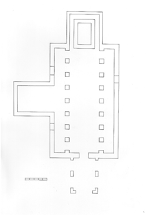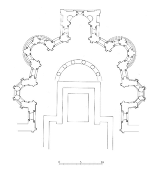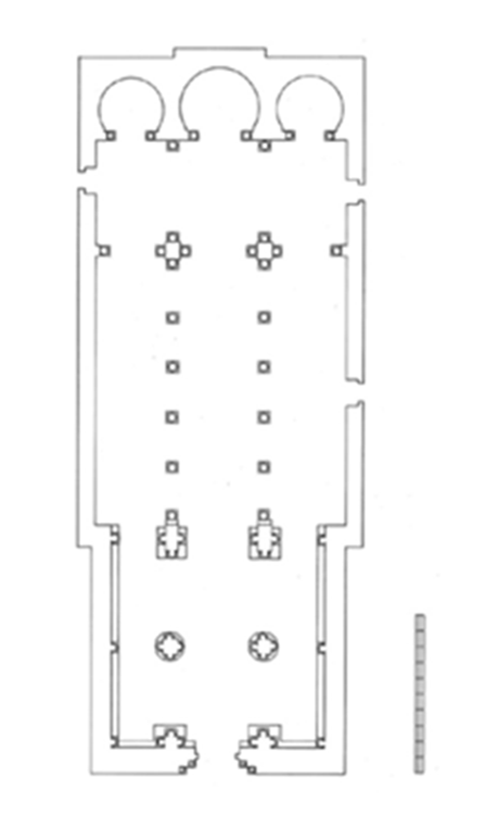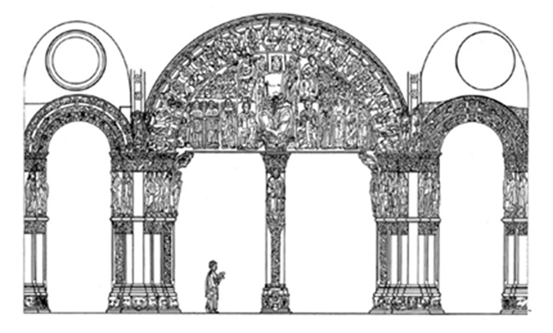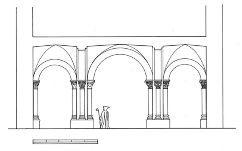 Lo cierto es que si hay algún resto arqueológico que permita asociar su construcción con ese mecenazgo real, como ya indiqué, tal fue la espaciosa galilea anexada al templo prerrománico 86. Y dentro de ella, el elemento más destacado que se implementó para lo que en este trabajo me ocupa en las relaciones con Compostela, fue el umbral de separación con la iglesia prerrománica. Se trató de un triple acceso, rodada metáfora triunfal extendida en los arcos conmemorativos desde época romana e inyectada a partir del siglo IV en las basílicas cristianas con una significación rotundamente escatológica: el acceso al espacio eclesial en tanto prefiguración de la Jerusalén Celeste, es decir, la obtención de la vida eterna con referencia directa a los inhumados delante de ella ( figs. 2 y 10).