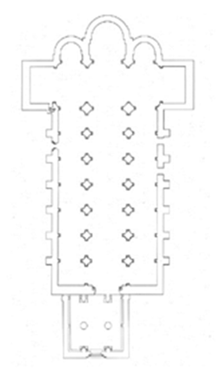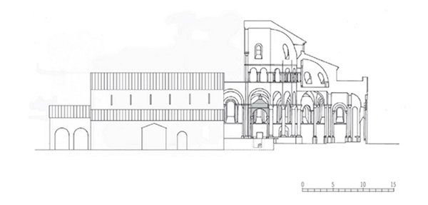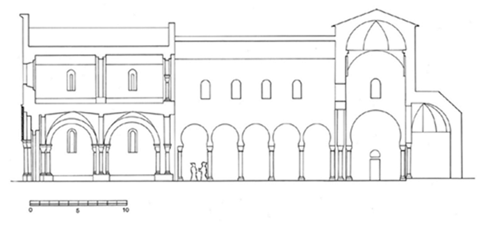 Las dos iglesias financiadas por Alfonso III debieron contar con proporciones semejantes -Compostela 32 x 14 m.; no sin prudencia Sahagún 29 x 15 m 19- si bien, aunque simples ambas a partir de su rigurosa horizontalidad y distribución en tres naves, probablemente las elevaciones respondían a estéticas diferentes: la primera debió plegarse a las líneas de las iglesias ovetenses mientras que la segunda adoptaría la estética denominada con mayor o menor fortuna ‘mozárabe’ o de ‘repoblación’ 20 ( figs. 1 y 2).