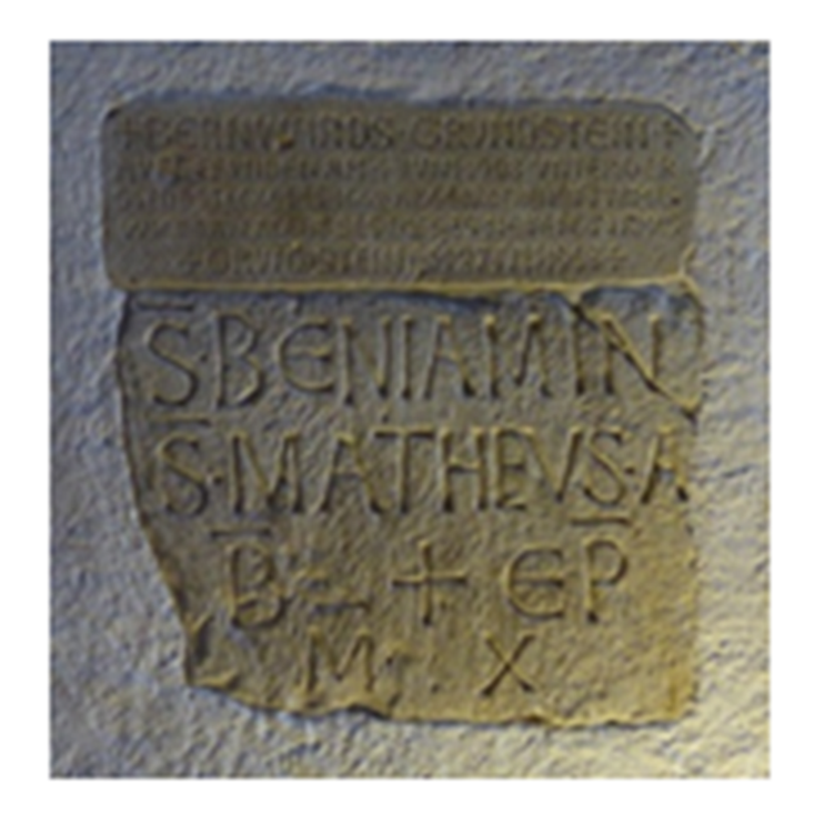 La tendencia en las grandes construcciones religiosas era que la jerarquía social, el obispo y el monarca, presidieran el acto litúrgico fundamentado en la colocación de una o varias piedras (12) grabadas de modo variable, pero en la que solía ser normativo la presencia de al menos una cruz. Un ilustrativo caso de piedra angular conservada es la ya mentada de la iglesia de San Miguel de Hildesheim en la que constan los nombres de Benjamín y de Mateo, hijo más joven de Isaac y primer evangelista, respectivamente; junto a ello las iniciales del obispo Bernward y la fecha (1010) 43. Una vez más la sempiterna dialéctica entre Antiguo y Nuevo Testamento desarrollada por la patrística 44 ( fig. 5).