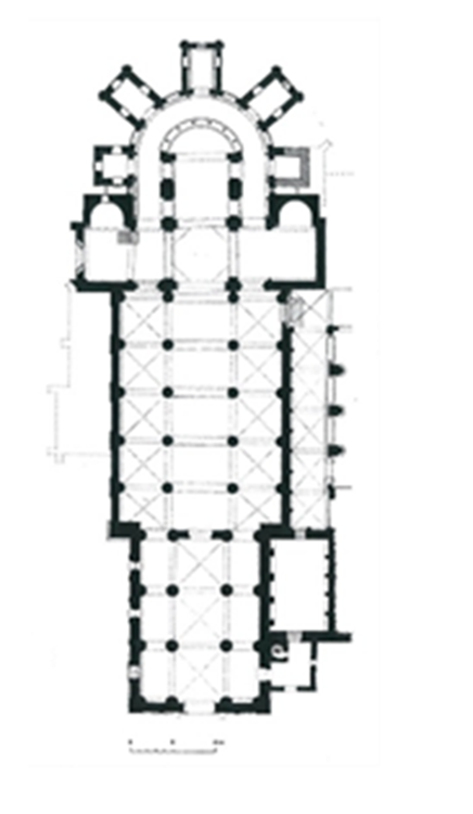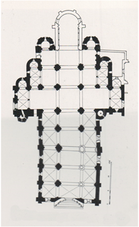 Es muy probable que el proyecto románico de una nueva iglesia en Sahagún fuera el resultado de la salida del monasterio de la profunda y agresiva crisis que experimentó con los desórdenes urbanos desarrollados entre 1110 y 1117. La desaparición del que fuera su valedor, el rey Alfonso VI, y la realidad de una iglesia prerrománica dañada después de los disturbios generan un clima propicio para considerar la sustitución: es significativo que en 1116 la reina Urraca emitiera el privilegio por el cual el monasterio podía emitir moneda incrementando su liquidez 80. Tal logro había sido obtenido por Gelmírez en 1108 de un Alfonso VI en vísperas de su óbito, ad opus apostolice ecclesie81. Pero el proyecto asumido por los monjes estaba muy alejado del compostelano: si bien el avance de los trabajos fue igualmente muy quebrado, el modelo de templo adoptado asemejaba esclerótico en contraste al catedralicio, con una cabecera de tres ábsides abiertos a un pequeño transepto. Pero no solo ante la catedral, lo cual podría ser menos evidente dada la dimensión pública del santuario jacobeo, también frente a otras propuestas monásticas anteriores tanto peninsulares (Santa María de Ripoll o La Seo de Urgell por poner dos significativos ejemplos) como, de modo más contundente, del otro lado de los Pirineos. Resulta aún más elocuente respecto al caso de la abadía gascona de Saint-Sever a fines del siglo XI, ubicada en un territorio muy permeable a las relaciones institucionales del eje Pamplona-León 82 ( fig. 8).