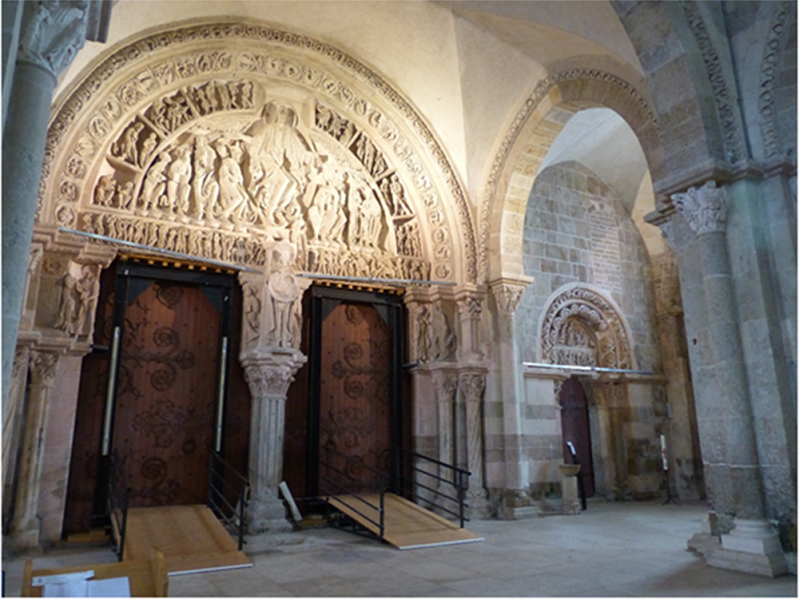 Impulsado desde los siglos VIII y IX por la arquitectura carolingia adquiere un singular desarrollo en el área borgoñona desde donde arraiga como un recurso frecuente. En los siglos X y XI aparece sujeta al tejido arquitectónico que separaba iglesia de bloque occidental: en esta dirección el ejemplo más significativo de los conservados es el de la iglesia del poderoso monasterio borgoñón de Saint-Philibert de Tournus (ca. 1030-1040) (Saône-et-Loire) ( fig. 11). Más adelante, ya en la primera mitad del siglo XII, el procedimiento –de elevada asimilación en el territorio- se duplica introduciéndose también en el exterior de la fachada: en este sentido el templo también monástico de La Madeleine de Vézelay (Yonne) (ca. 1120-1130) supone la más excelsa materialización de esa concreción ( fig. 12) 87.