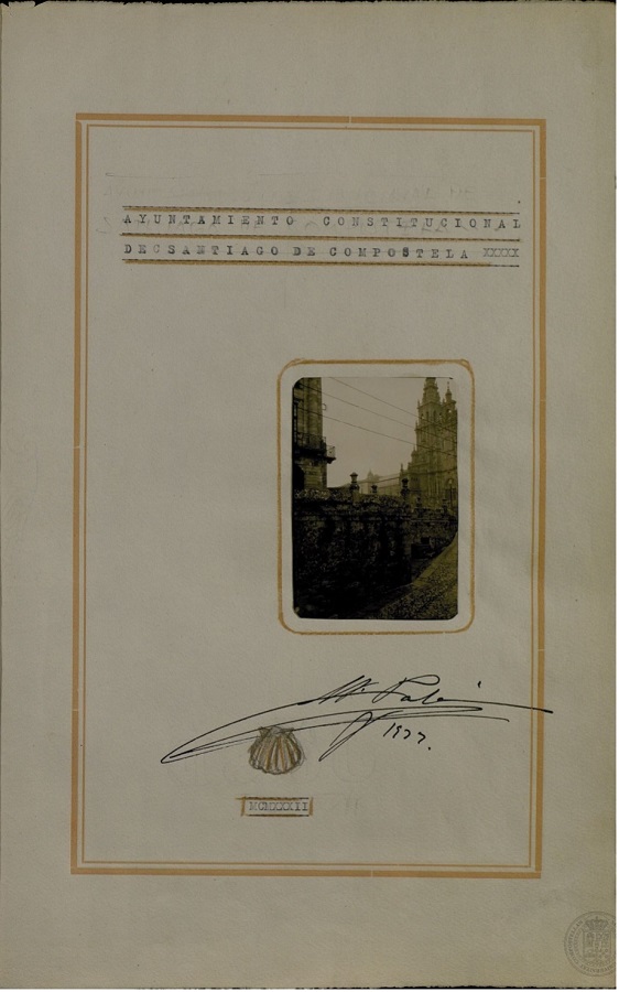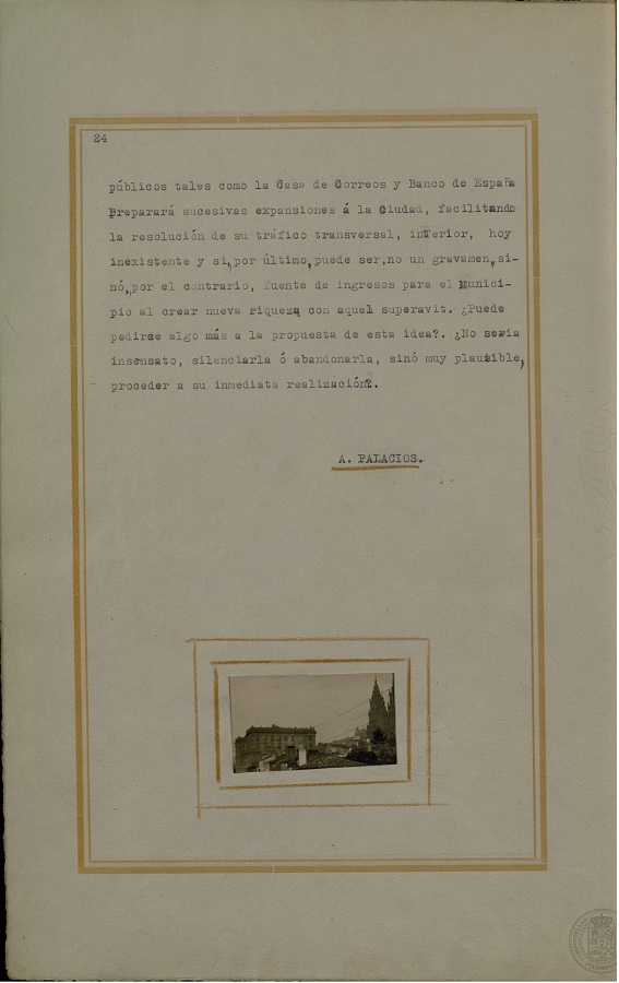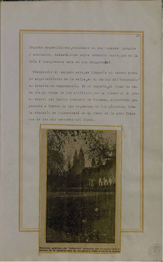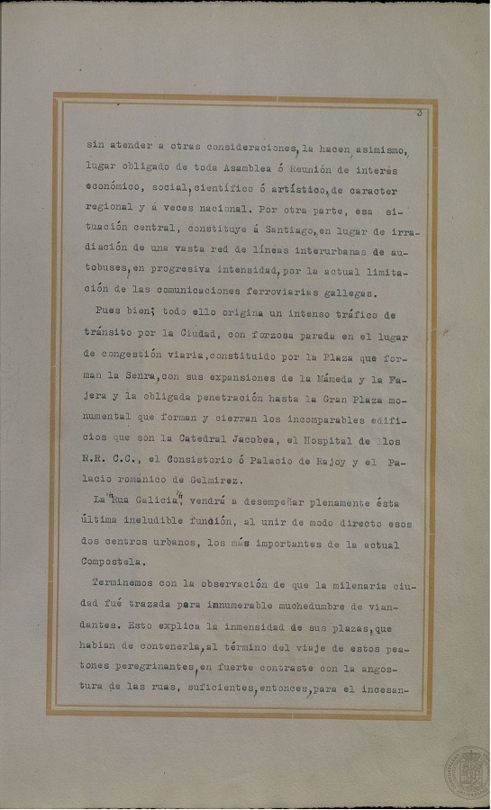 Pues bien: todo ello origina un intenso tráfico de tránsito por la Ciudad, con forzosa parada en el lugar de congestión viaria, constituido por la Plaza que forman la Senra, con sus expansiones de la Mámeda [sic] y la Fajera y la obligada penetración hasta la Gran Plaza monumental que forman y cierran los incomparables edificios que son la Catedral Jacobea, el Hospital de los RR.CC., el Consistorio o Palacio de Rajoy y el Palacio románico de Gelmírez.
