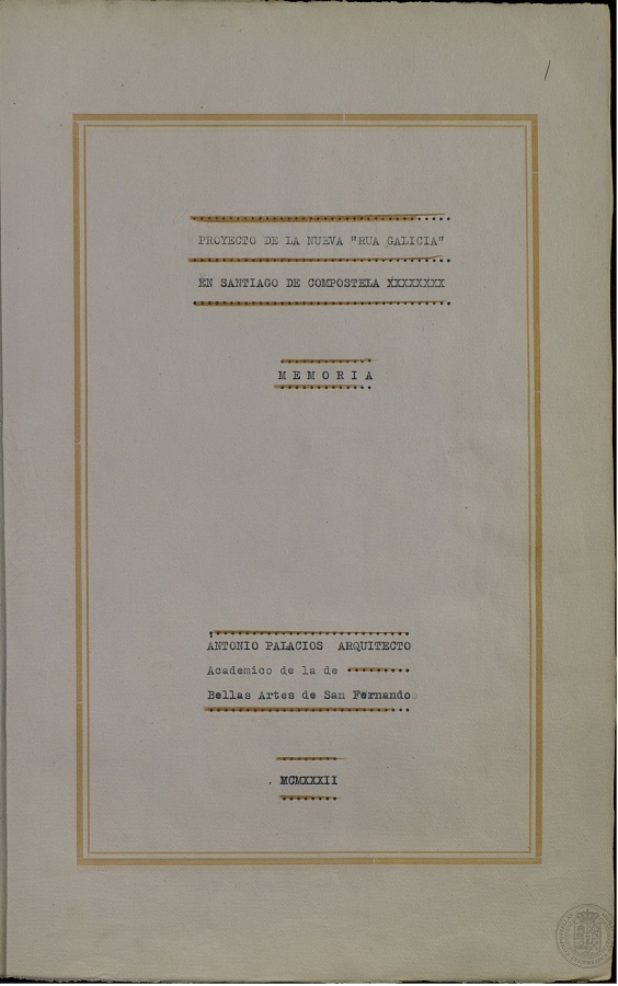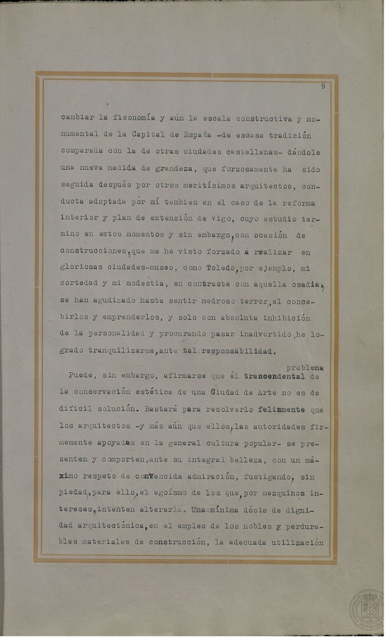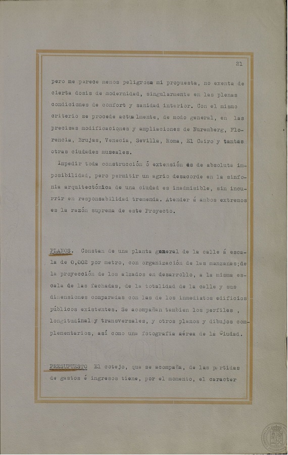 No es preciso decir, que si en tales conceptos la preocupación respecto a la armonía del trazado de la calle con el resto de la red viaria presente y futura de la Ciudad, me ha guiado en su concepción, más aún ha producido honda huella en mí conciencia artística, el sólo pensamiento de que, con tal empeño, precisaría alterar, siquiera en parte, la euritmia total de esta Ciudad histórica, con peligro de malograr la nuevamente creada.