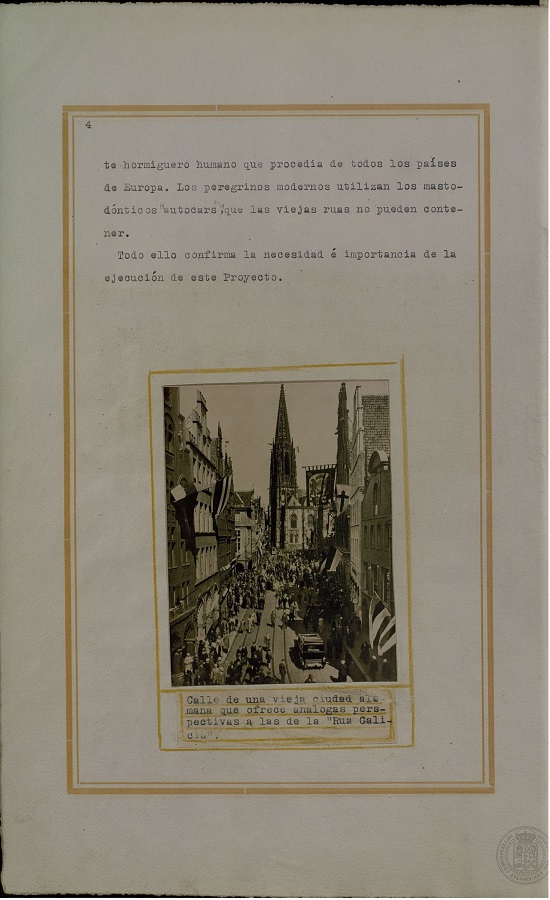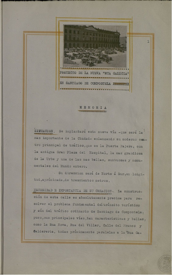 NECESIDAD E IMPORTANCIA DE SU CREACIÓN. La construcción de esta calle es absolutamente precisa para resolver el problema fundamental del tránsito turístico y aún del tráfico ordinario de Santiago de Compostela, pues sus principales vías, tan características y bellas, como la Rúa Nova, Rúa del Villar, Calle del Franco y Calderería, todas próximamente paralelas a la “Rúa Galicia” y la transversal de Fonseca y Gelmírez son incapaces, ni aun conjuntamente, de resolver, en la actualidad, su cometido.