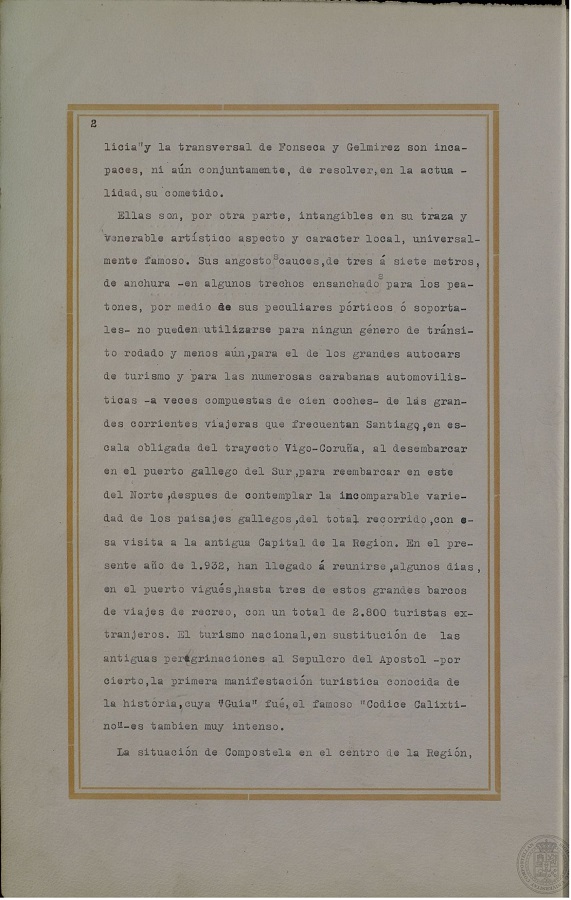 Ellas son, por otra parte, intangibles en su traza y venerable artístico aspecto y carácter local, universalmente famoso. Sus angostos cauces, de tres a siete metros, de anchura –en algunos trechos ensanchado para los peatones, por medio de sus peculiares pórticos o soportales– no pueden utilizarse para ningún género de tránsito rodado y menos aún, para el de los grandes autocares de turismo y para las numerosas carabanas [sic] automovilísticas –a veces compuestas de cien coches– de las grandes corrientes viajeras que frecuentan Santiago, en escala obligada del trayecto Vigo-Coruña, al desembarcar en el puerto gallego del Sur, para reembarcar en este del Norte, después de contemplar la incomparable variedad de los paisajes gallegos, del total recorrido, con esa visita a la antigua Capital de la Región. En el presente año de 1932, han llegado a reunirse, algunos días, en el puerto vigués, hasta tres de estos grandes barcos de viajes de recreo, con un total de 2.800 turistas extranjeros. El turismo nacional, en sustitución de las antiguas peregrinaciones al Sepulcro del Apóstol –por cierto, la primera manifestación turística conocida de la historia, cuya “Guía” fue, el famoso “Códice Calixtino”– es también muy intenso.