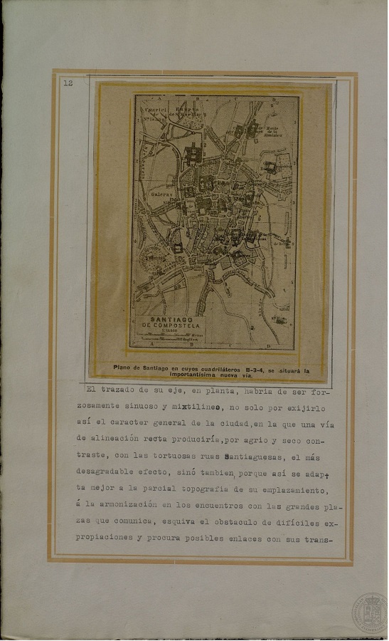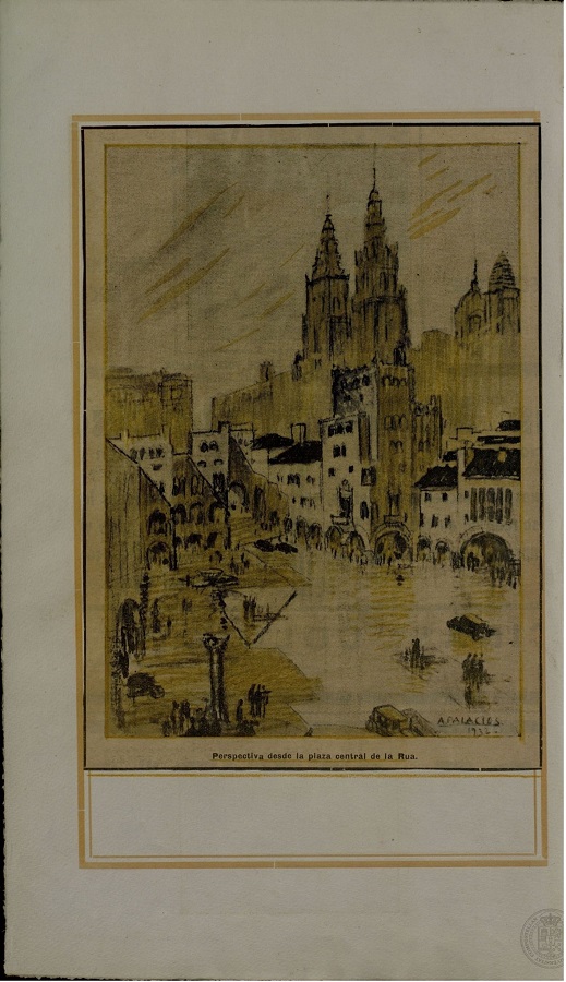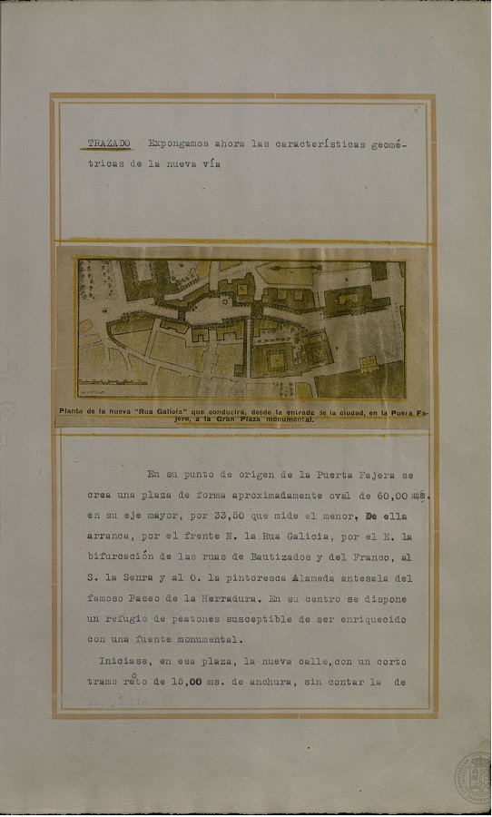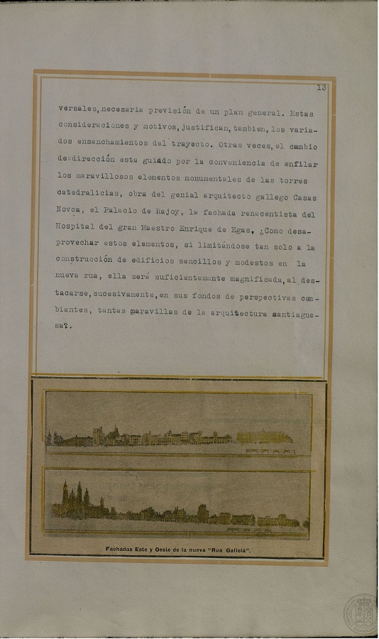 El trazado de su eje, en planta, habría de ser forzosamente sinuoso y mixtilíneo, no sólo por exigirlo así el carácter general de la ciudad, en la que una vía de alineación recta produciría, por agrio y seco contraste, con las tortuosas rúas Santiaguesas, el más desagradable efecto, sino también porque así se adapta mejor a la parcial topografía de su emplazamiento, a la armonización en los encuentros con las grandes plazas que comunica, esquiva el obstáculo de difíciles expropiaciones y procura posibles enlaces con sus transversales, necesaria previsión de un plan general. Estas consideraciones y motivos justifican, también, los variados ensanchamientos del trayecto. Otras veces, el cambio de dirección está guiado por la conveniencia de enfilar los maravillosos elementos monumentales de las torres catedralicias, obra del genial arquitecto gallego Casas Novoa, el Palacio de Rajoy, la fachada renacentista del Hospital del Gran Maestro Enrique de Egas. ¿Cómo desaprovechar estos elementos, si limitándonos tan sólo a la construcción de edificios sencillos y modestos en la nueva rúa, ella será suficientemente magnificada, al destacarse, sucesivamente, en sus fondos de perspectivas cambiantes, tantas maravillas de la arquitectura santiaguesa?