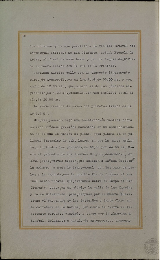 Después, pasando bajo una construcción montada sobre un arco en “cabalgavía”, se desemboca en un ensanchamiento de la Rúa -a manera de plaza- cuya planta es un polígono irregular de ocho lados, en que la mayor amplitud, incluidos los pórticos, de 67,00 por 44,00 ms. Hacia el promedio de sus frentes E. y O. desembocan, en esta plaza, nuevas calles ,que enlazan a la “Rúa Galicia”, la primera -a modo de transversal- con las rúas centrales y la segunda, con la posible Vía de Cintura al actual casco urbano, que, cruzando sobre el Campo de San Clemente, corta, en su mitad, a la calle de las Huertas y la de Entrerríos; pasa, después, por la Cuesta Nueva, cruza el encuentro de los Basquiños y Santa Clara, en la carretera de La Coruña (en donde se cierra un importante circuito viario), y sigue por la Almáciga a Bonaval. Solamente a título de anteproyecto propongo esta importante vía (que se separa del objeto fundamental de esta Memoria), puesto que ella deberá ser motivo de un estudio especial.