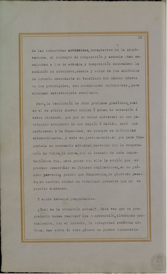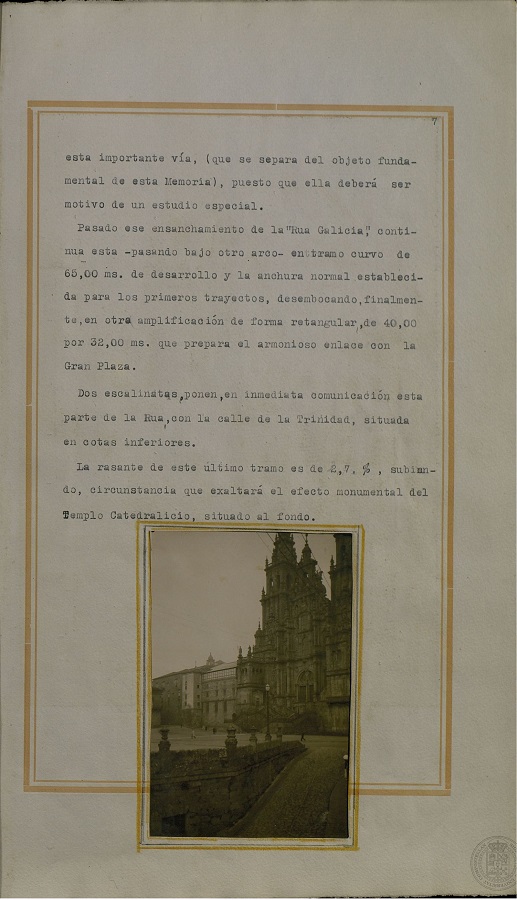 Pero, la resolución de otro problema gravísimo, cual es el de añadir nuevas calles o zonas de extensión a estas ciudades, que por su valor universal no son patrimonio exclusivo de una Región o Nación, sino que pertenecen a la Humanidad, es siempre de dificultad extraordinaria, y este es, precisamente, el que para Compostela es necesario afrontar, marcando con la cooperación de todos, la norma, con el trazado de esta importantísima Rúa, para guiar con ella la acción que es preciso desarrollar en futuras ampliaciones, en un próximo porvenir, puesto que Compostela, de glorioso pasado, es también ciudad de vitalidad presente que no es posible contener.