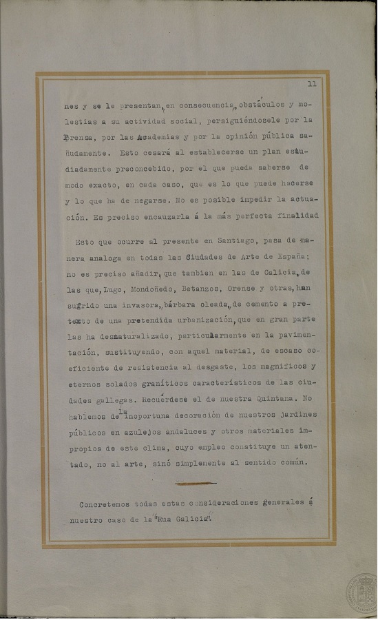 Esto que ocurre al presente en Santiago, pasa de manera análoga en todas las Ciudades de Arte de España; no es preciso añadir, que también en las de Galicia, de las que Lugo, Mondoñedo, Betanzos, Orense y otras, han sufrido una invasora, bárbara oleada, de cemento a pretexto de una pretendida urbanización, que en gran parte las ha desnaturalizado, particularmente en la pavimentación, sustituyendo, con aquel material, de escaso coeficiente de resistencia al desgaste, los magníficos y eternos solados graníticos característicos de las ciudades gallegas. Recuérdese el de nuestra Quintana. No hablemos de la inoportuna decoración de nuestros jardines públicos en azulejos andaluces y otros materiales impropios de este clima, cuyo empleo constituye un atentado, no al arte, sino simplemente al sentido común.