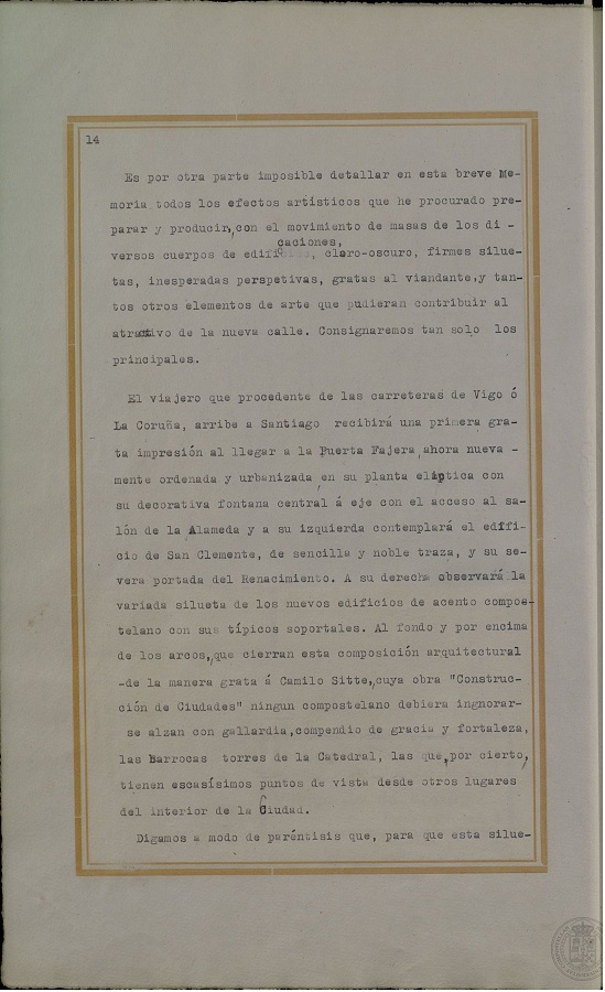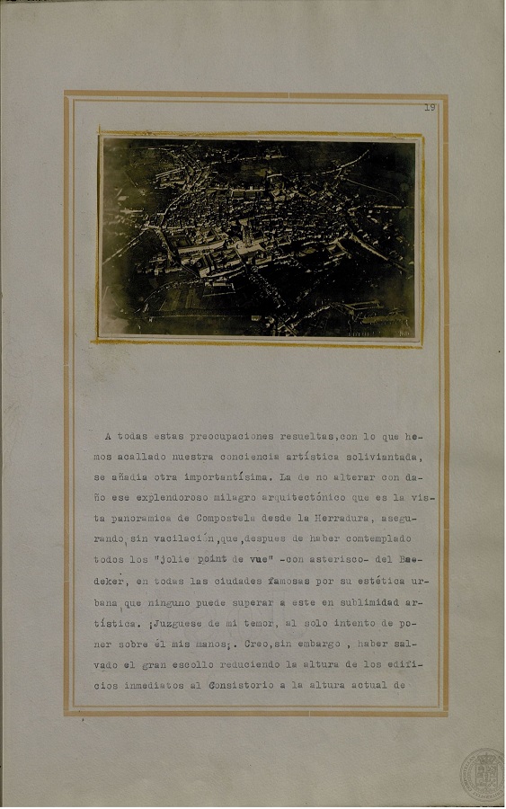 A todas estas preocupaciones resueltas, con lo que hemos acallado nuestra conciencia artística soliviantada, se añadía otra importantísima. La de no alterar con daño ese esplendoroso milagro arquitectónico que es la vista panorámica de Compostela desde la Herradura, asegurando, sin vacilación, que, después de haber contemplado todos los “jolie point de vue” -con asterisco- del Baedeker, en todas las ciudades famosas por su estética urbana, que ninguno puede superar a este en sublimidad artística ¡Júzguese de mi temor, al sólo intento de poner sobre él mis manos! Creo, sin embargo, haber salvado el gran escollo reduciendo la altura de los edificios inmediatos al Consistorio a la altura actual de nueve ms. Con lo cual la magnífica Logia de las salas del Museo Diocesano y las torres que le complementan, quedan íntegramente visibles y las edificaciones más altas próximas a San Clemente, no sólo no alteran esa grandiosa visión de un ensueño arquitectural en que las numerosas áureas torres semejan altísimas llamaradas que alcanzan al cielo y que en virtud de algún prodigio quedaran repentinamente petrificadas, sino que, aún, modestamente pudieran complementarlas.