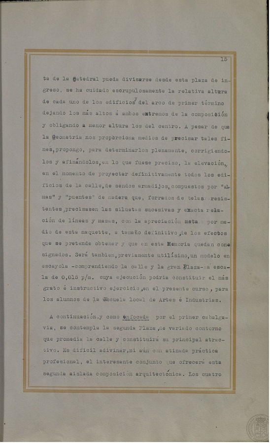 Digamos a modo de paréntesis que, para que esta silueta de la Catedral pueda divisarse desde esta plaza de ingreso, se ha cuidado escrupulosamente la relativa altura de cada uno de los edificios y del arco de primer término dejando los más altos a ambos extremos de la composición y obligando a menor altura los del centro. A pesar de que la Geometría nos proporciona medios de precisar tales fines, propongo, para determinarlos plenamente, corrigiéndolos y afinándolos, en lo que fuese preciso, la elevación, en el momento de proyectar definitivamente todos los edificios de la calle, de sendos armadijos, compuestos por “almas” y “puentes” de madera que, forrados de telas resistentes, precisasen las siluetas sucesivas y exacta relación de líneas y masas, con la apreciación neta por medio de esta maquette, a tamaño definitivo, de los efectos que se pretende obtener y que en esta Memoria quedan consignados. Será también, previamente utilísimo, un modelo en escayola -comprendiendo la calle y la gran Plaza- a escala de 0,015 p/m. cuya ejecución podría constituir el más grato e instructivo ejercicio, en el presente curso, para los alumnos de la Escuela local de Artes e Industrias.