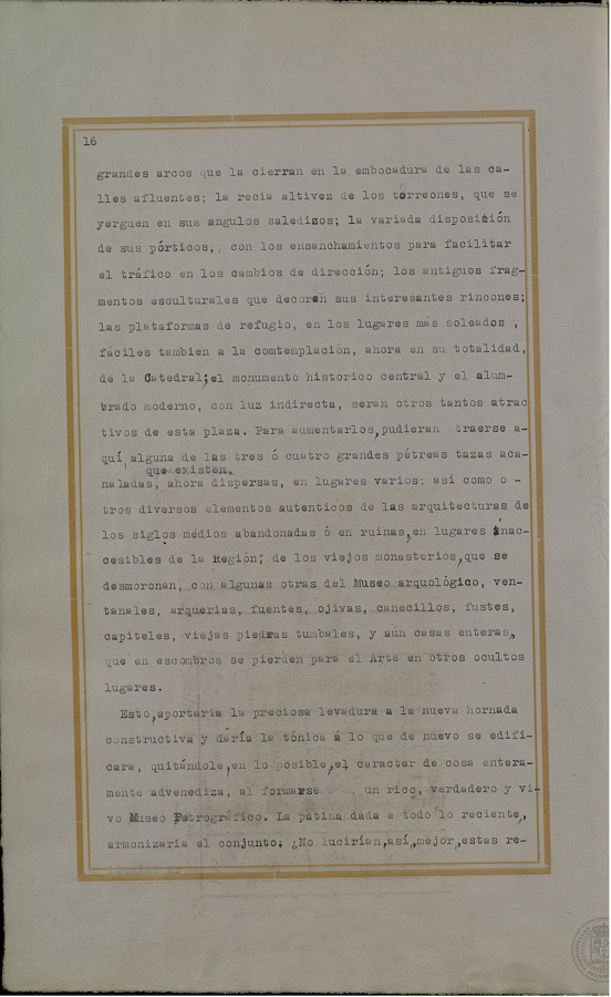 Esto, aportaría la preciosa levadura a la nueva hornada constructiva y daría la tónica a lo que de nuevo se edificara, quitándole, en lo posible, el carácter de cosa enteramente advenediza, al formarse un rico, verdadero y vivo Museo Petrográfico. La pátina dada a todo lo reciente, armonizaría el conjunto. ¿No lucirían, así, mejor, estas reliquias arqueológicas, colocadas en sus lugares propios y adecuados, destacándose sobre desnudos muros, que en la fría e inexpresiva sala de una Gliptoteca?
