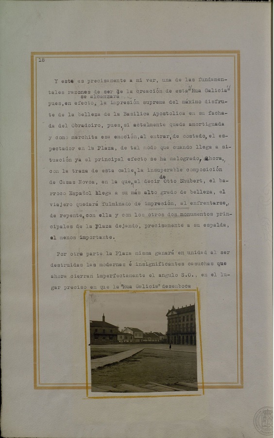 Y esta es precisamente a mi ver, una de las fundamentales razones de ser de la creación de esta “Rúa Galicia” pues, en efecto, se alcanzará la impresión suprema del máximo disfrute de la belleza de la Basílica Apostólica en su fachada del Obradoiro, pues, si actualmente queda amortiguada y como marchita esa emoción, al entrar, de costado, el espectador en la Plaza, de tal modo que cuando llega a situación ya el principal efecto se ha malogrado, ahora, con la traza de esta calle, la insuperable composición de Casas Novoa, en la que, al decir de Otto Schubert, el barroco Español llega a su más alto grado de belleza, el viajero quedará fulminado de impresión, al enfrentarse, de repente, con ella y con los otros dos monumentos principales de la Plaza dejando, precisamente a su espalda, el menos importante.