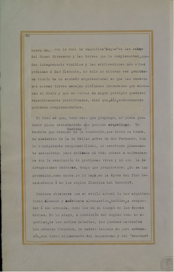 Yo bien sé que, todo esto que propongo, no puede producir plena satisfacción a un purista arqueólogo. Yo tendría que renegar también de la condición, que tanto me honra, de académico de la de Bellas Artes de San Fernando, con la consiguiente responsabilidad, si estuviera plenamente satisfecho; pero dedicada mi vida entera a enfrentarme con la resolución de problemas vivos y no con la de divagaciones teóricas, tengo que preguntarme ¿No se ha procedido, como ahora yo lo hago, en la época del fino Renacimiento o en los siglos floridos del Barroco?