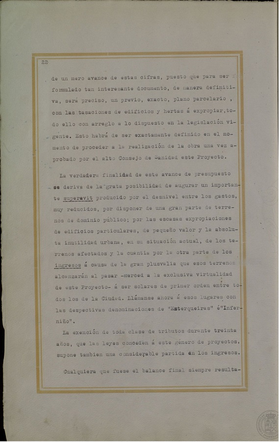 La verdadera finalidad de este avance de presupuesto se deriva de la grata posibilidad de augurar un importante superávit producido por el desnivel entre los gastos, muy reducidos, por disponer de una gran parte de terrenos de dominio público; por las escasas expropiaciones de edificios particulares, de pequeño valor y la absoluta inutilidad urbana, en su situación actual, de los terrenos afectados y la cuantía por la otra parte de los ingresos a causa de la gran plusvalía que esos terrenos alcanzarán al pasar -merced a la exclusiva virtualidad de este Proyecto- a ser solares de primer orden entre todos los de la Ciudad. Llámanse ahora a esos lugares con las despectivas denominaciones de “Esterqueiras” e “Inferniño”.