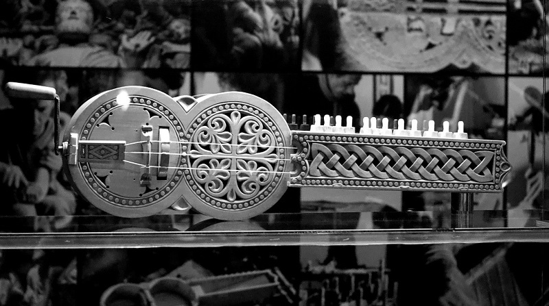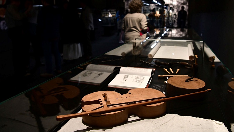 Por último, pero como eje central que vertebraba toda la exposición, estaba la sección dedicada al proceso de construcción. Pretendía ser ésta un homenaje al trabajo intelectual y manual realizado por los lutieres y demás implicados. En ella se podían contemplar planos, piezas de los instrumentos a medio hacer, herramientas de trabajo, documentos…, así como los resultados presentados en libros y en grabaciones de grupos (españoles y extranjeros) interpretadas con las réplicas realizadas. Muestra estas últimas, de cómo se cumplió el objetivo principal del gran proyecto: volver a escuchar los instrumentos tallados en piedra.
