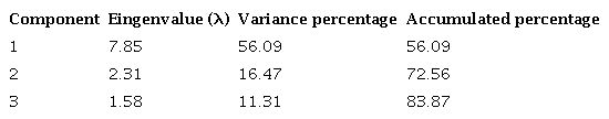 Kaiser-Meyer-Olkin test was significant (P <0.001), with a value of 0.75, which indicated that the data matrix was adequate for the application of the SMIM. In the PC analysis, the first three explained more than 83% of the studied variability. PC 1 showed the greatest variance (56.09%), and was the most important. PC 2 and 3 explained lower variance (16.47 and 11.30%, respectively) (table 1).