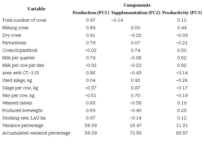 Using the matrix of rotated components, by Varimax method, variables with preponderance values superior to 0.65 were identified (table 2). Variables total number of cows, milking cows, dry cows, number of parturitions, production per quarter, total paddocks of Cuba CT-115, number of weaned calves, produced live weight and LAU/ha were preponderant indicators in PC 1. Therefore, this new variable was called Production.