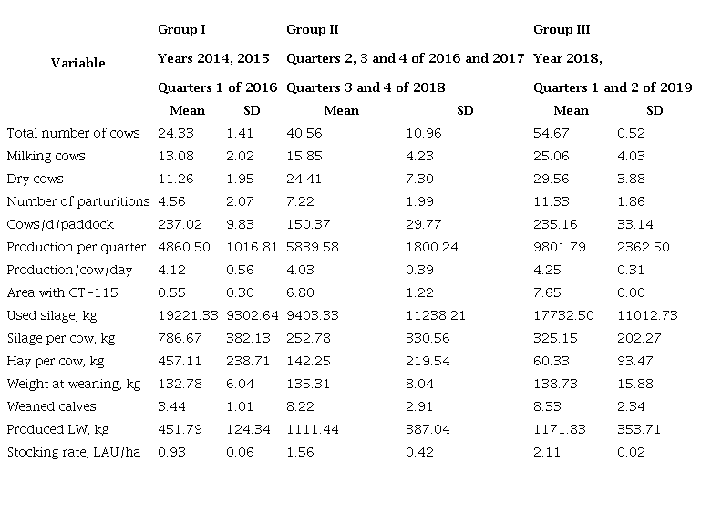 The fact that group I gathered the initial quarters with much lower indicators, demonstrates that, over time, there was a well-defined productive impact, capable of separating the most productive cases in group III. The total number of cows, milking cows, dry cows, weaned calves, milk production (kg), produced live weight (kg) and stocking rate LAU/ha, increased by 124.7, 91.6, 162.5, 142.2, 101.7, 159.4 and 126.9%, respectively, between group I and III. As a consequence, the implementation of this technology had better capacity to feed animals and increase size of herd under production. Hay and silage gradually decreased in each group, due to the increase of forage produced in the biomass bank.