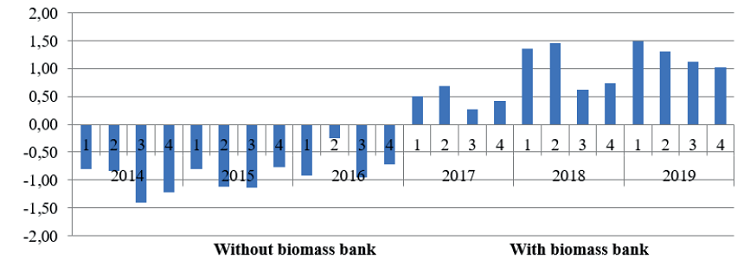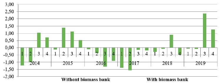 According to Torres et al. (2013), coefficients of factorial measures express impact indexes for each scenario, based on the principal components. Results of this analysis for PC Production are presented in figure 1. Bars show the impacts in the scenarios, from 2014 to 2019. In the first 12 trimesters, biomass bank technology was not applied, with stocking rate of 0.96 LAU/ha. The changes from negative to positive values in the scenarios indicate the impact of the biomass bank on results, which refer to the last 12 studied quarters, corresponding to the period from 2017 to 2019. This demonstrates that PC Production changed since the beginning of biomass bank technology application.
